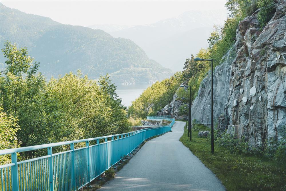 Die Hardangerbrücke verbindet die Südseite (bei Bu) mit der Nordseite (bei Vallavik) des Hardangerfjord. Auf einem eigenen Fuß- und Radweg kannst du die Brücke gehend oder per Rad überqueren.