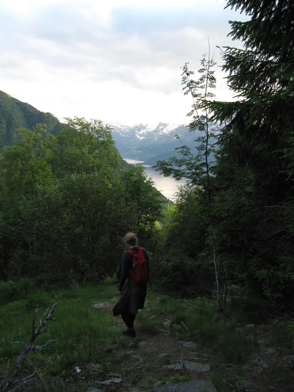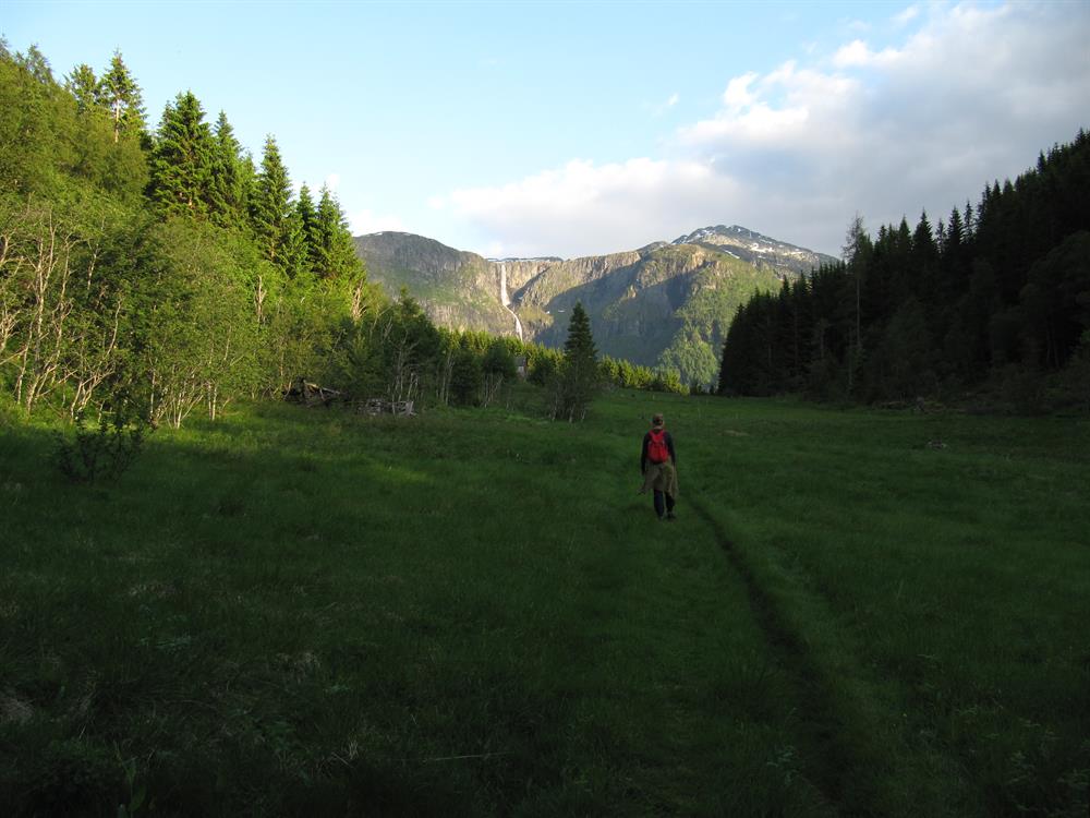 Beschreibung: Beginne beim Supermarkt in Lofthus. Folge der Hauptstraße RV 13 in nördlicher Richtung bis zur Wegkreuzung. Folge nun der alten Straße FV 102 in Richtung Lofthus Camping. Nach ca. 300 m bei der Schule Opedal Skule geht man nach rechts und folgt dem steilen, asphaltierten Hofweg vorbei an Obstgärten. Nach weiteren ca. 300 m teilt sich der Weg. Gehe nach rechts und folge dem Schotterweg bis der Weg sich wieder teilt. Dort steht ein Schild mit der Aufschrift „Hovden" oder „Skodnasete". Folge dem Wanderweg durch die Landschaft Skodnasete. Von dort führt ein Pfad zu Hovden hoch. Folge den Schildern. Von Hovden aus hat man einen herrlichen Blick auf den Fjord und Lofthus. Sei vorsichtig beim Aufstieg. Auf dem Rückweg kann man auf der südlichen Seite von Hovden / Skodnasete hinabgehen. Der Waldweg führt durch einen dichten Wald. Teilweise ist der Weg sehr steil hier. Man kann entweder im Wohngebiet Legena oder im Flusstal Elvedalen hinabkommen. Von dort aus geht man durch Opedal zurück zum Startpunkt.