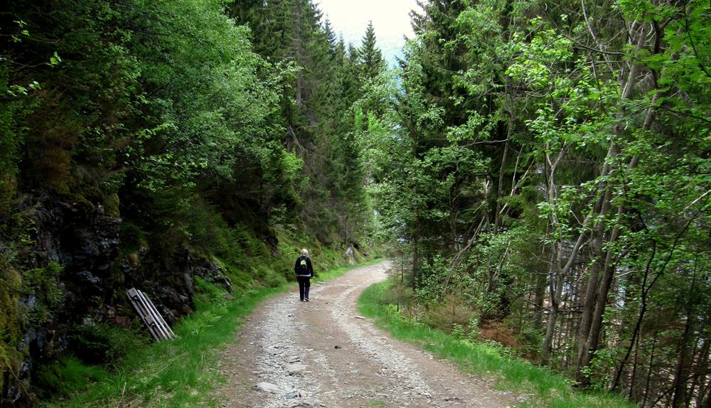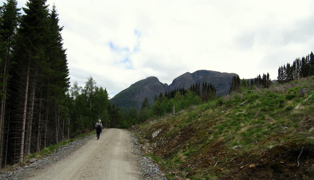 Start in Røte: Vom Parkplatz aus in Røte führt ein Schotterweg nach Heng (ca. 750 m.ü.M.) Der Waldweg ist privat und es ist somit nicht erlaubt dort mit dem Auto entlang zu fahren.