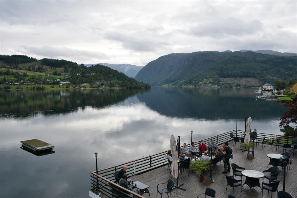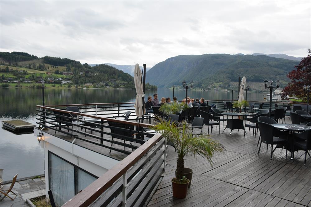 Sonnenterrasse auf dem Dach mit prachtvoller Aussicht über den Fjord und den Ort.