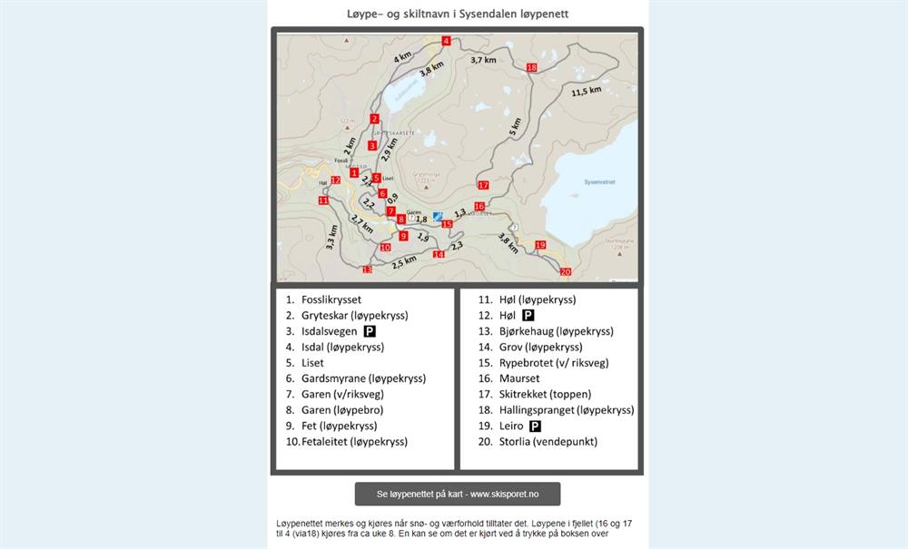 Dei merka og preparerte skiløypene i Sysendalen er i hovudsak gradert som blå for middels godt trente skiløparar med grunnleggande skiferdigheiter. Dei delane av løypenettet som er meir krevjande er merka av i kartet med høgare gradering.