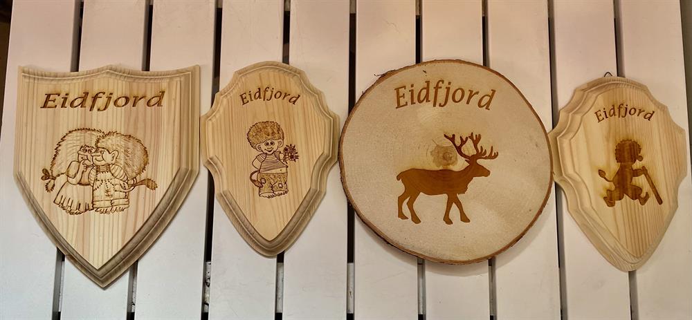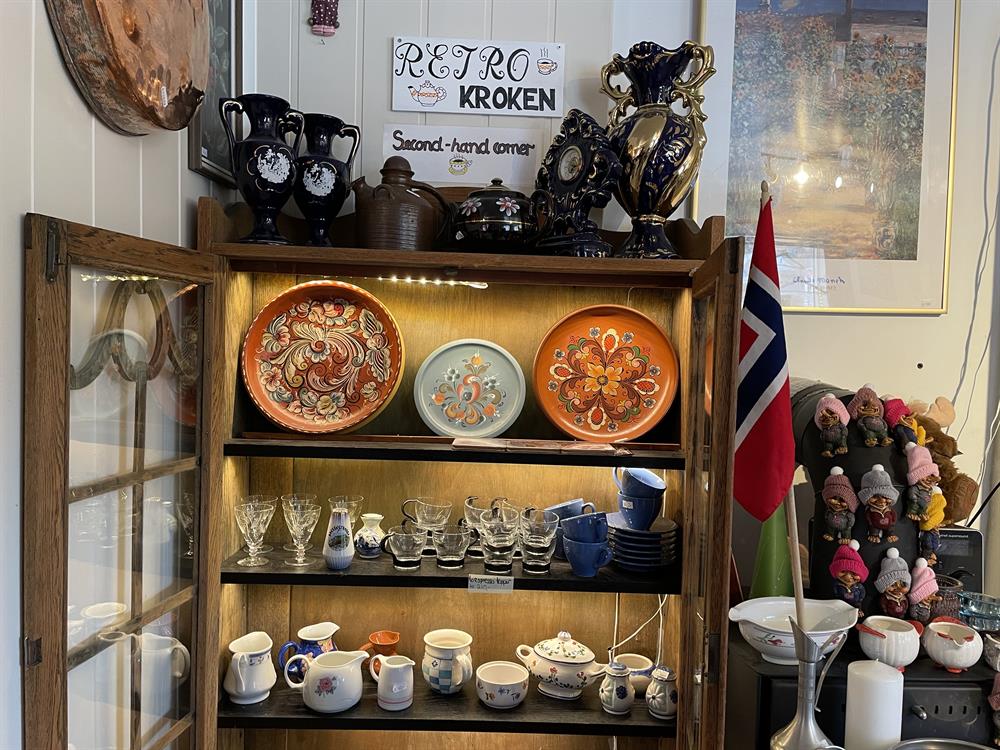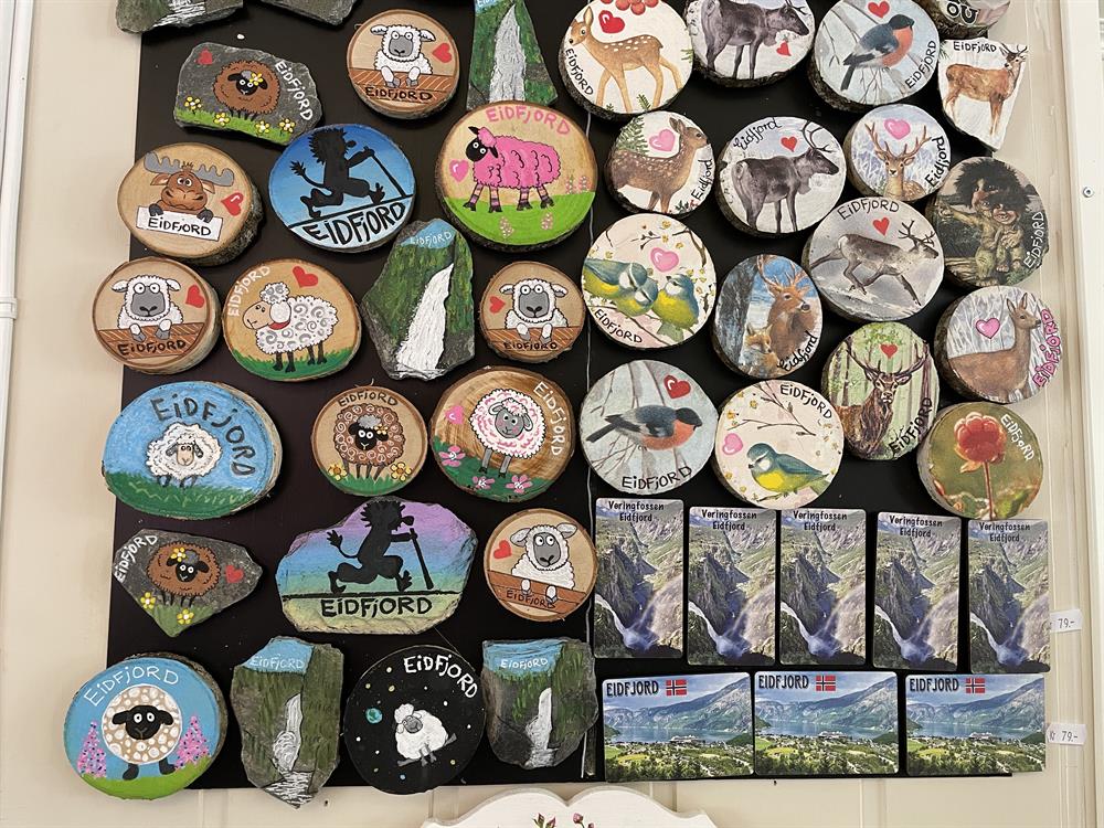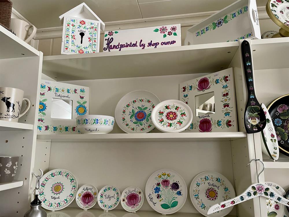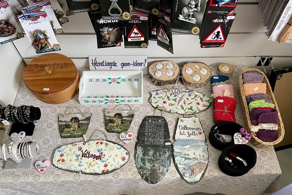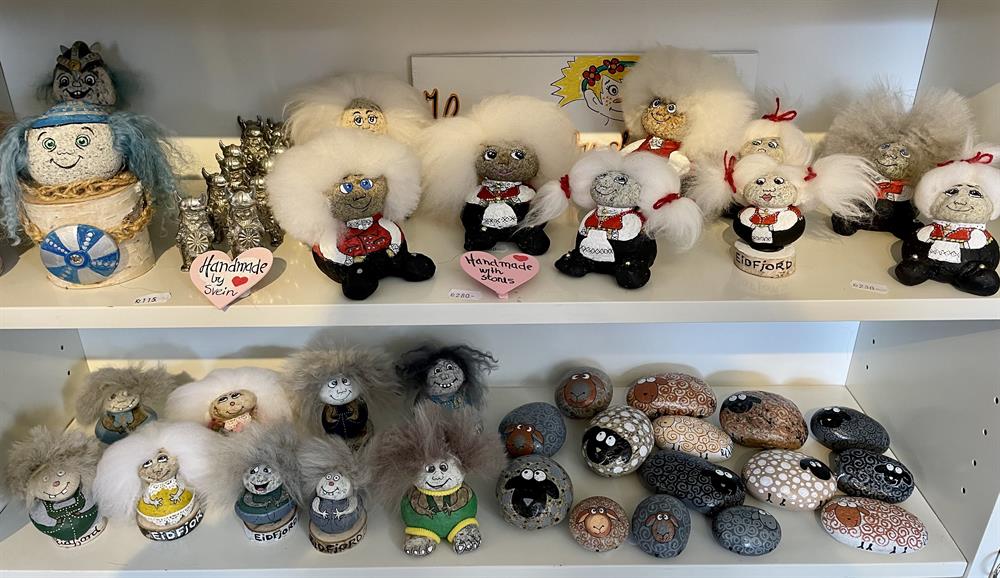 Hos oss finn du vakker rosemåling, måla av lokale kunstnarar og butikkeigaren sjølv. Me har også handlaga steinfigurar og skiferskilt, strikka ullvarer, ulike treprodukt, sydde vesker og hekla gåver – alt laga med omtanke og kjærleik.
