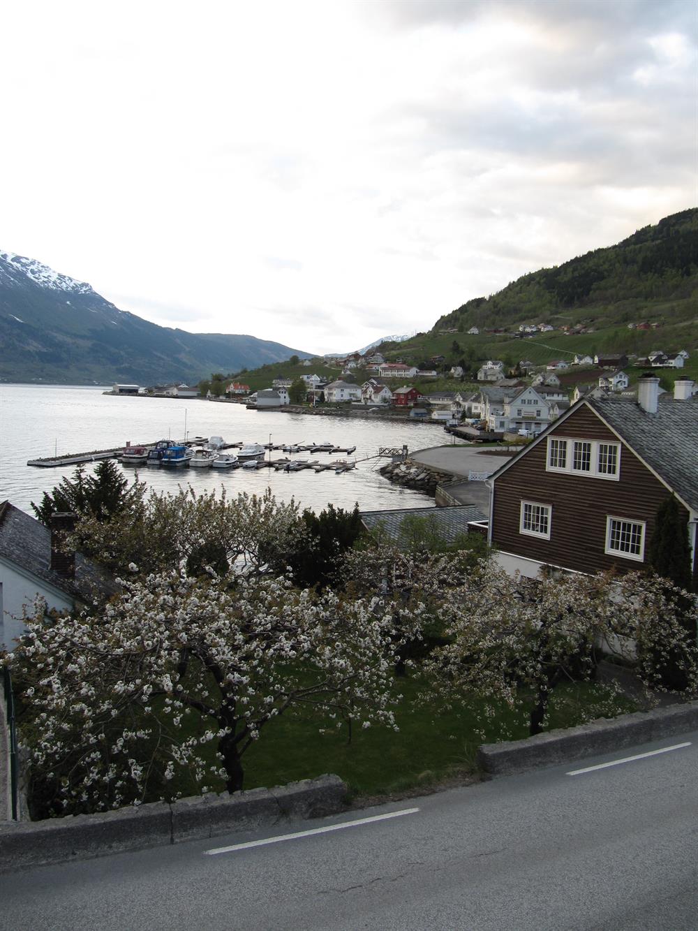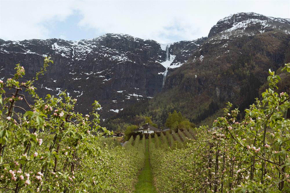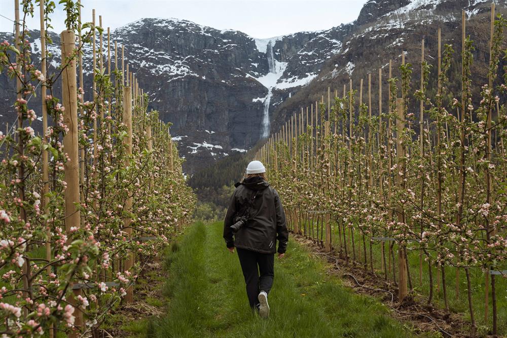 When starting by the supermarket in Lofthus, cross road RV 13 and follow pedestraian/cycling route southwards to the crossroads by Ullensvang Church. Take the road on left hand, and walk past Hardanger Youth Hostel/ Hardanger Folkehøgskule and through a residential area. About 1 km after the youth hostel walk across the bridge and follow the road on the left hand. This road goes past the fruit farms in Opedal. About 1 km after the bridge take a dirt road on the right hand and continue past some farms. The dirt road takes a turn left and stops joins a paved road. Follow the paved road on right hand, until it ends. From the end there is a steep track going down to Lofthus Camping. From the camp site a paved road goes south, past Opedal School, and back to the supermarket after about 1.5 km. Starting from Hotel Ullensvang it is possible to access the Fruit Trail either from the supermarket or Opedal School.
