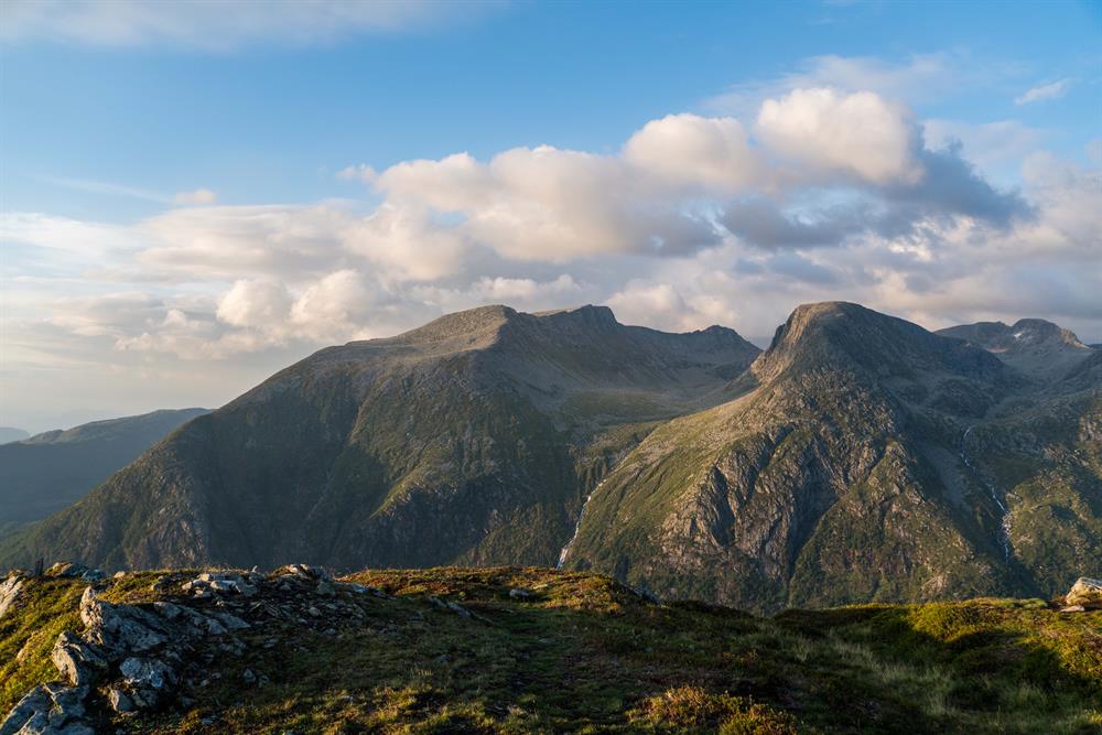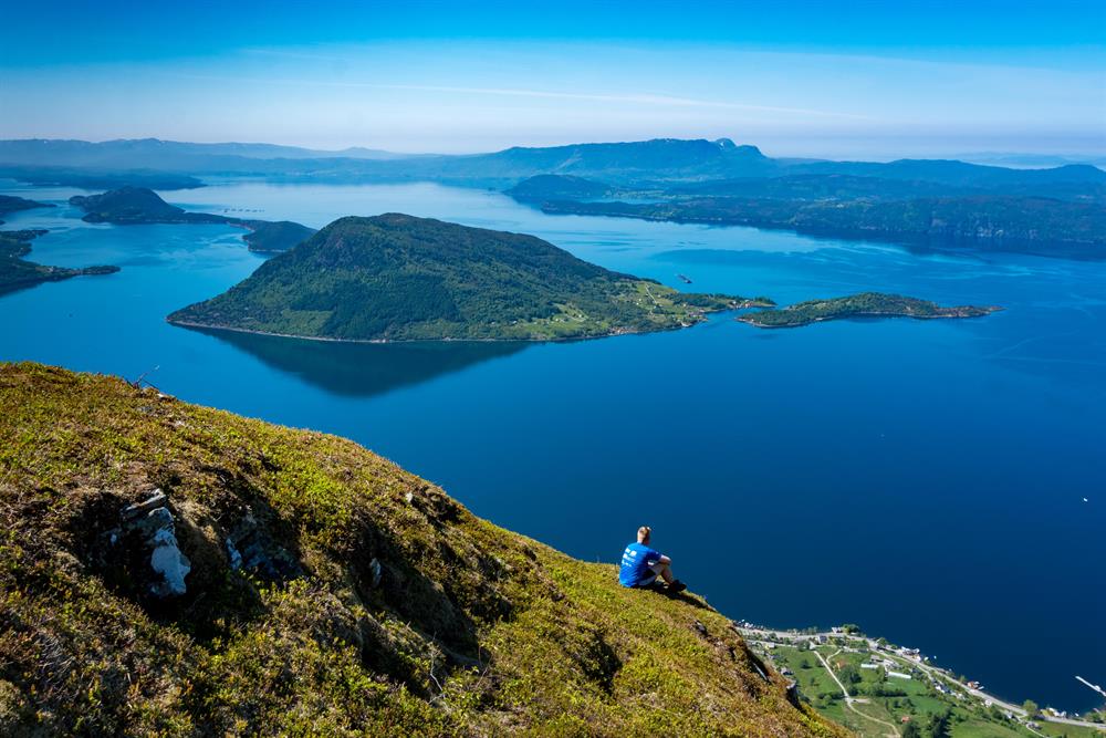 Before the tree-line, the path goes through outlying fields and mixed forest. There is a beautiful view of Rosendal and the neighboring towns between Sunnhordland and Hardanger, with ocean, fjords, waterway nature and majestic mountain areas.
