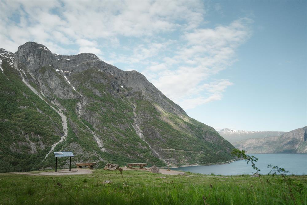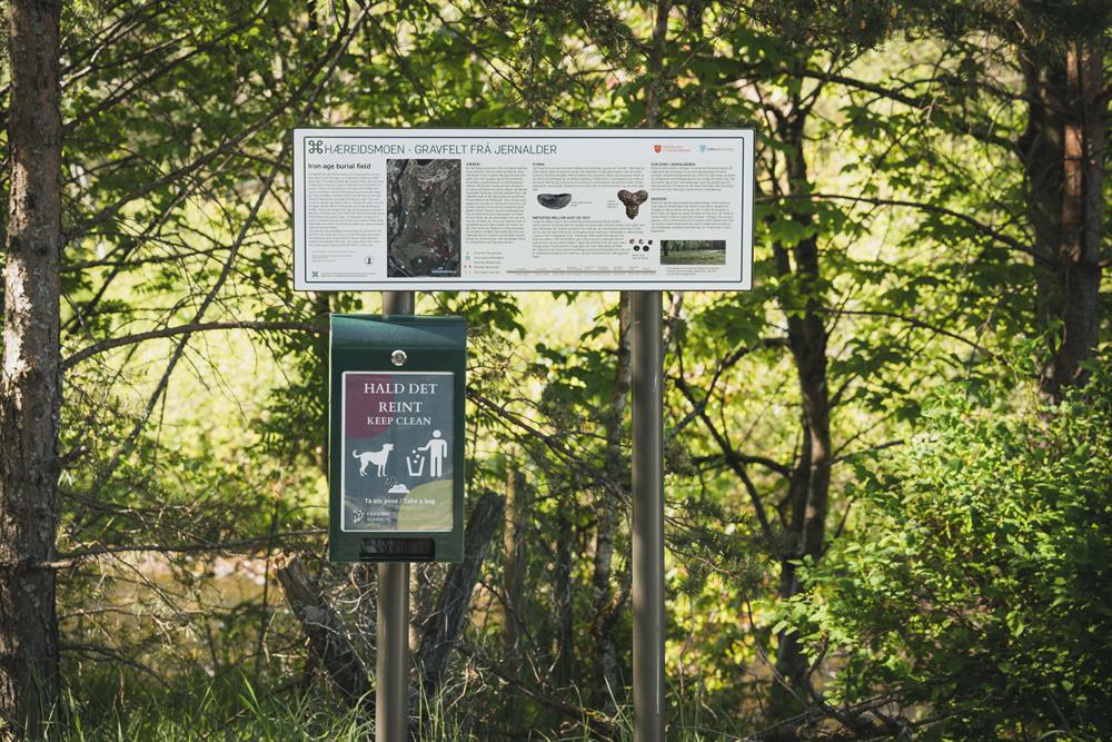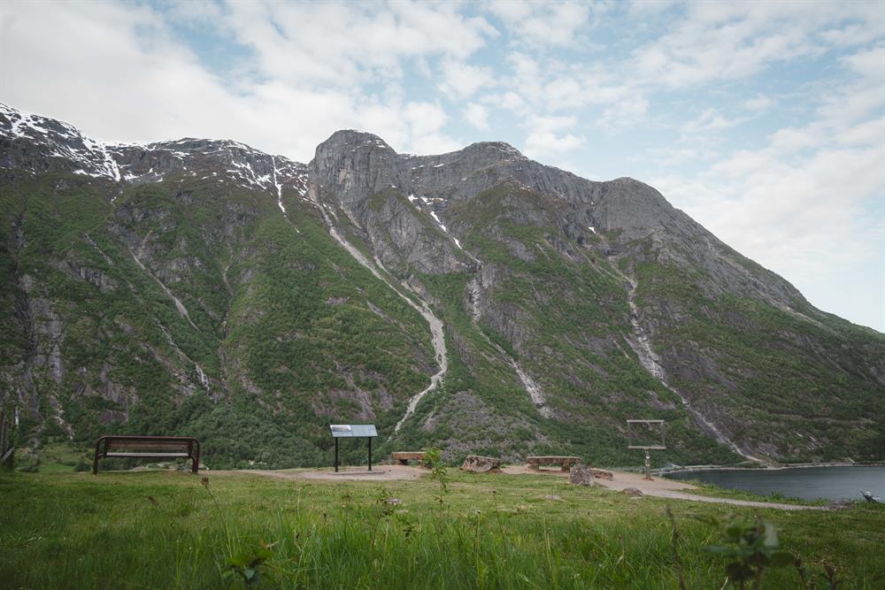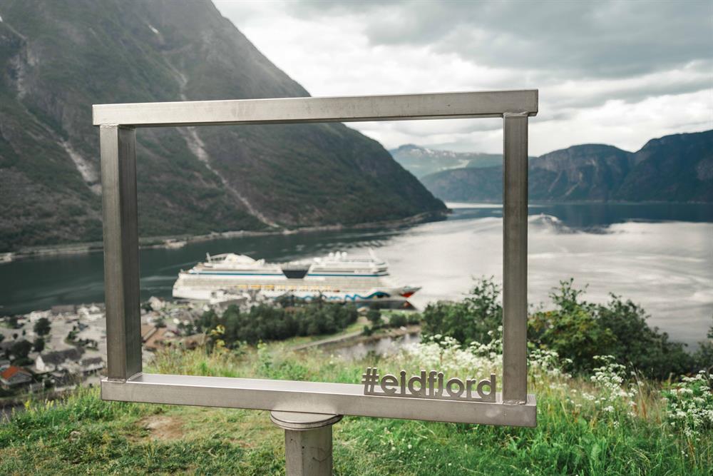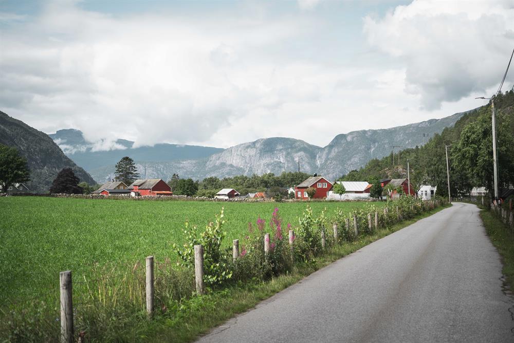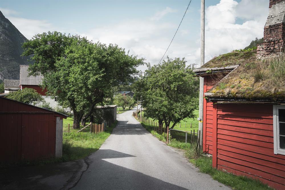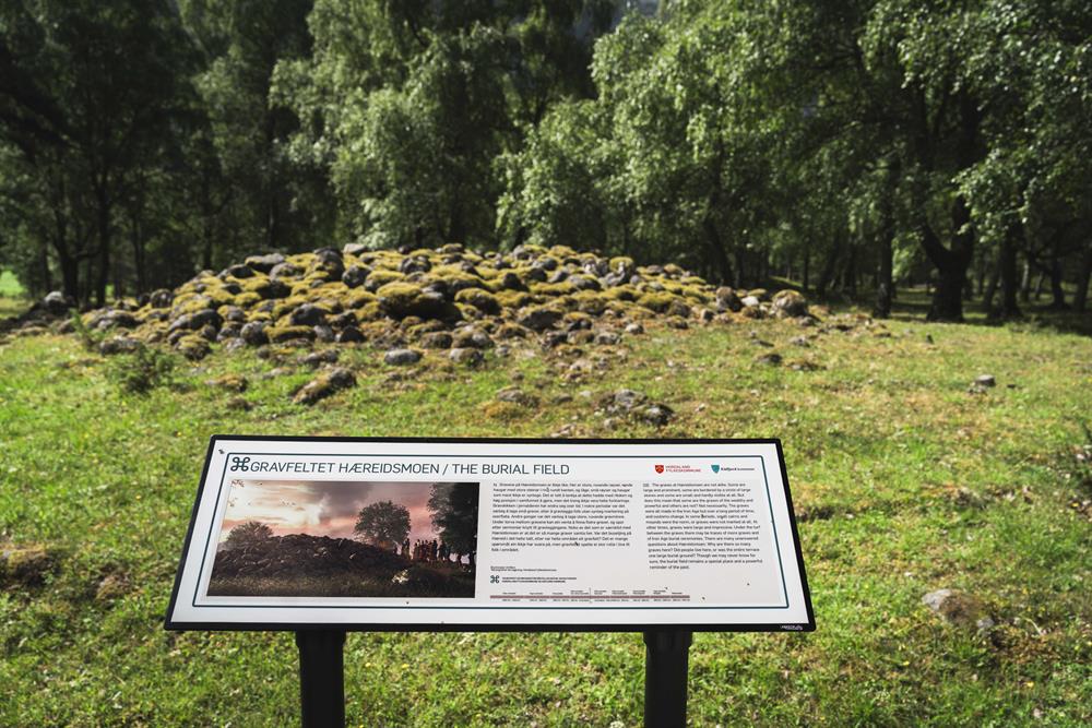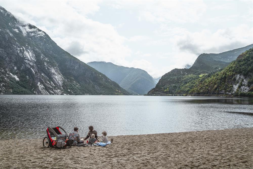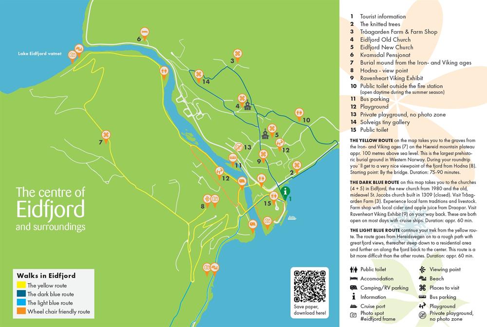 The yellow route / Hæreid round walk is a 5,5 km long walking path taking you on a scenic, historical tour surrounded by nature. Starting directly from the village centre, the tour takes you to the Eidfjord Lake, where you can enjoy the long, sandy beach or make a photo stop by the #Eidfjord frame. Thereafter you walk uphill for about 10 minutes to discover the Hæreid terrace where you will go back in time and see the burial mounds from the Iron-and Viking ages. Last stop on your hike is at the very scenic Hodna viewpoint, where you can enjoy the view of the town centre, fjord and mountains, as well as take a photo with another #Eidfjord frame. Return back to the center down the hill towards the fjord.