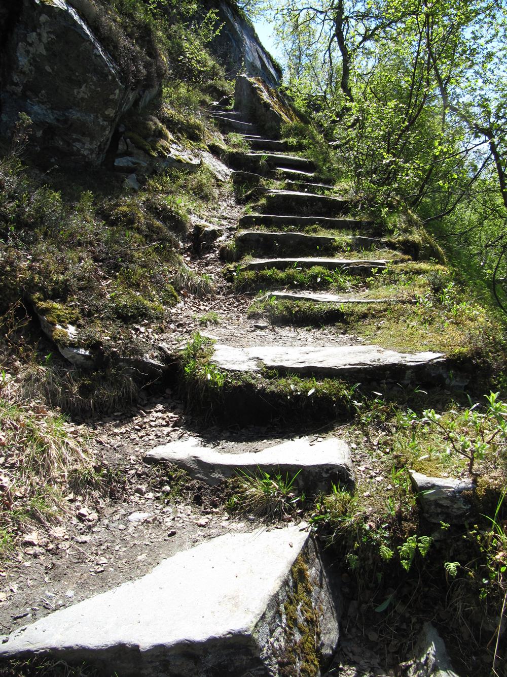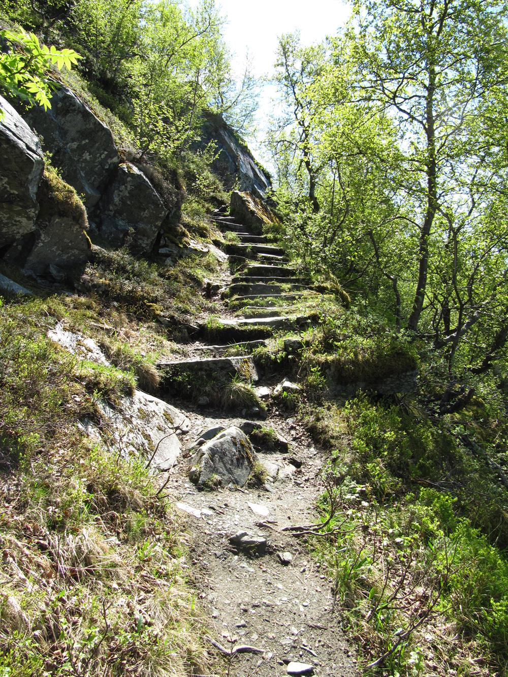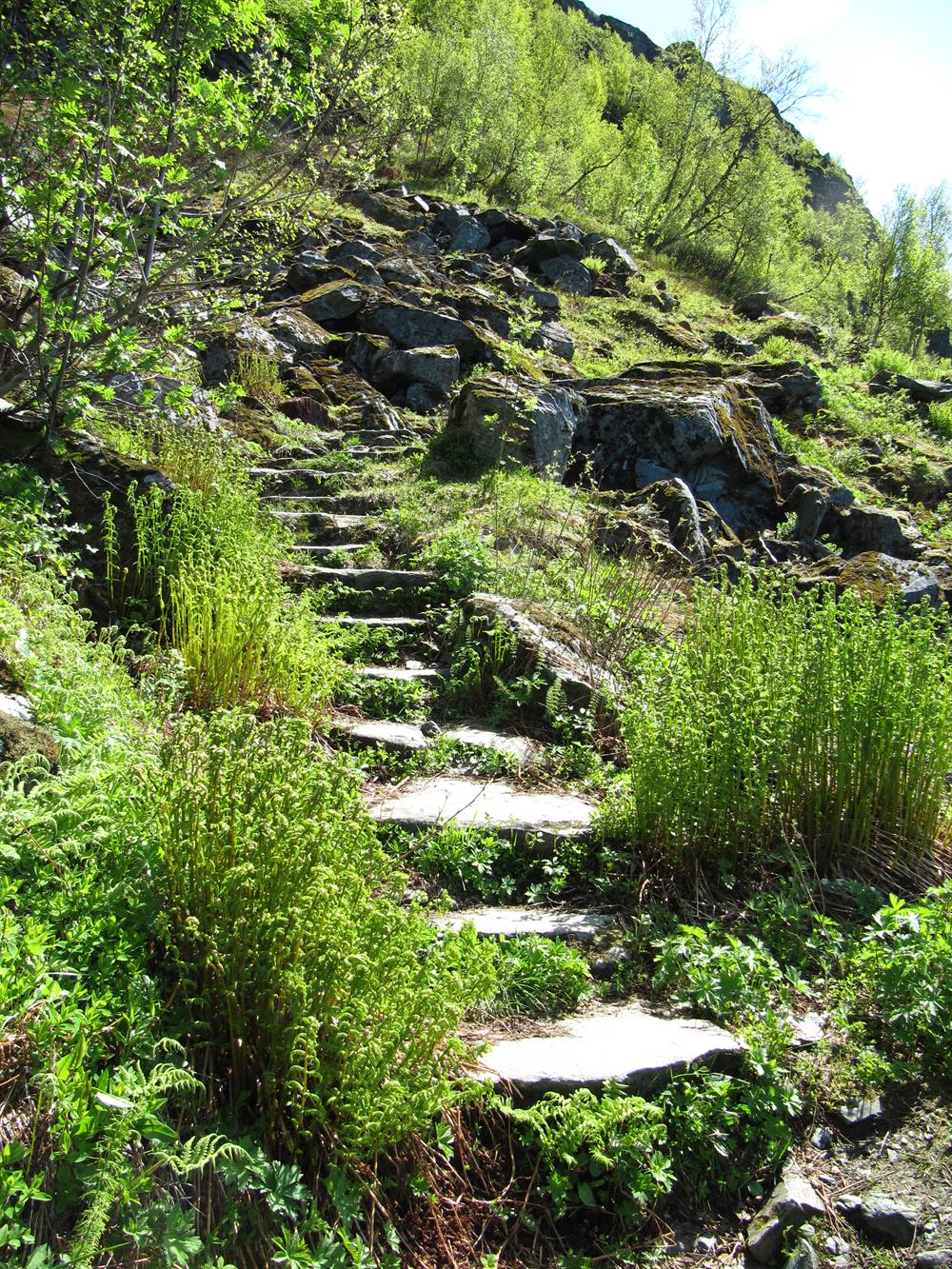 Description: When starting by the supermarket in Lofthus, follow road RV 13 northwards. After 50 metres take local road Fv102 on the right and walk direction Lofthus Camping. After about 300 metres, by Opedal School, take a steep paved road on right hand. After about 300 metres the road splits and take the dirt road on right hand. Follow this dirt road up the mountain, it is signed with ”Nosi”. From about 400 masl a track cuts the dirt road several places. The track is shorter and steeper. The dirt road ends at about 700 masl, from where the track goes to Nosi. Between 600 to 800 masl the so-called Monks’ Steps are found along the track. These steps were laid in order to facilitate the access to Hardangervidda in old times.