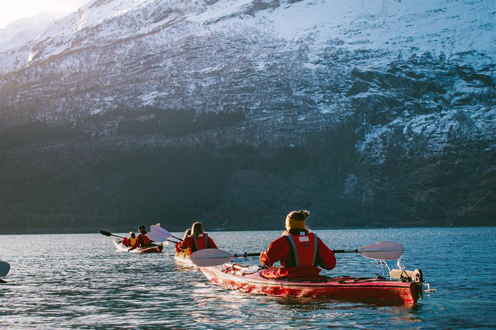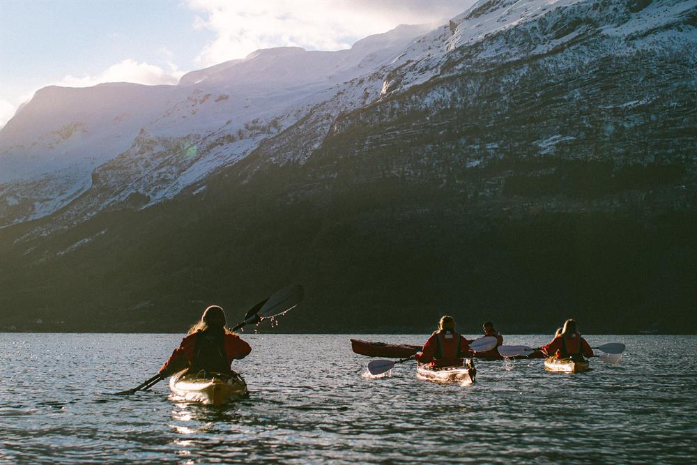 Å padle i kajakk på Hardangerfjorden rett utanfor Hotel Ullensvang eller på Sandvinsvatnet er den perfekte kombinasjonen av avslapping og å vera aktiv. Her får du nyte fjell, foss og isbre frå et flott kajakk-perspektiv på vinterstid medan naturen er kledd i is og snø. Guidane er profesjonelle, og lærer deg å bruke utstyret, så det krev ingen tidlegare erfaring. Vi stiller opp med alt av utstyr, inkludert tørr-/våtdrakt.