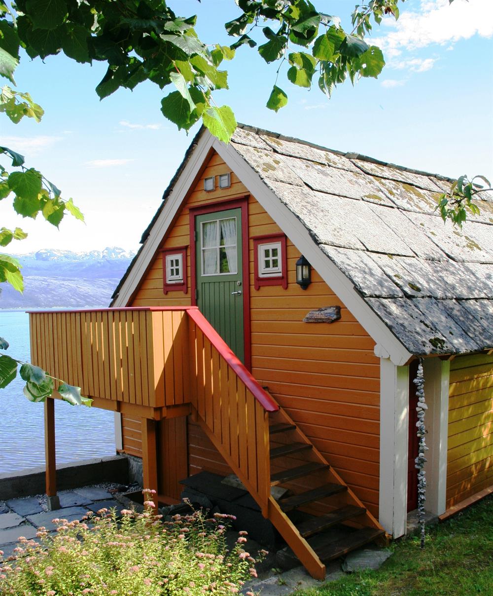 Er bygd i 1994 og er ca 50 m2. Hytte/ sjøhus med stove og fullt utstyrt kjøkkenkrok. 2 soverom med enkle/ doble senger, hems med to madrassar og veranda mot fjorden. Bad med dusj, wc og vaskemaskin.
