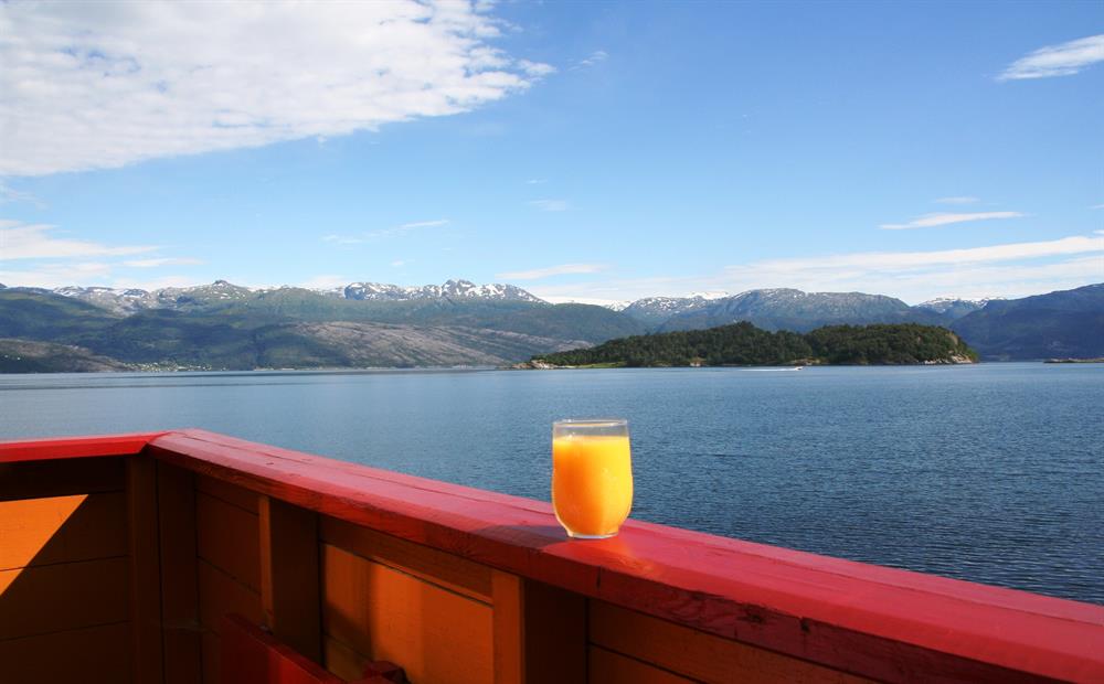 Veranda mot fjorden. Hytta har sers høg standard og er tilrettelagt for handicappa. Parkering ved hytta.