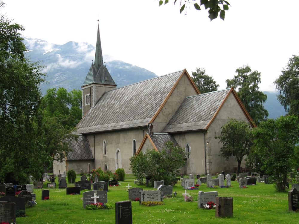 Er dette kyrkja som inspirerte Tidemann og Gude då dei måla "Brudeferden i Hardanger" i 1848? Steinkyrkja vart truleg bygd mellom 1250 og 1300, og kyrkjeklokkene er frå mellomalderen. Stilen er engelsk gotikk med spissbogar. Kyrkje vart påbygd mellom 1884 og 1886. Inventaret er frå ulike tidsepokar. Bernhard Greve har laga glasmåleria. Frå kyrkja har ein nydeleg utsikt mot Folgefonna. Gudstenester.