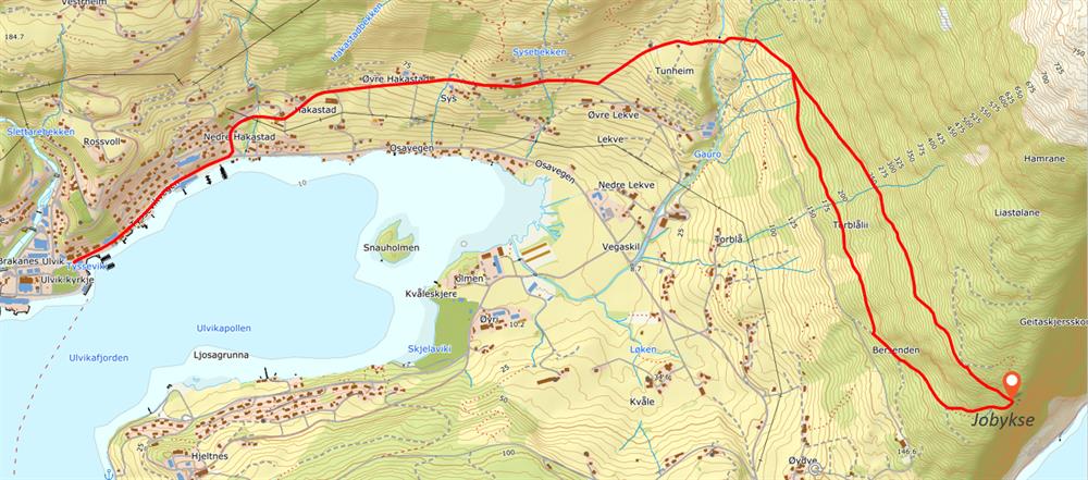Denne familievennlege turen ved Frukt- og siderruta byr på nokre av dei flottaste utsiktene over Ulvik og Osafjorden. Stien går til kanten av Jobykse, der du får ei panoramautsikt over heile Osafjorden og fjella rundt. Følg skilting frå sentrum forbi Syse gard på frukt- og siderruta. Ta til venstre på grusvegen ved skilting til Tunheim. Følg skilta ut til Liavegen og Jobykse. Ved start frå Ulvik sentrum, er turen 9 kilometer lang og tek 3 timar. Total stigning er 300 meter og stien er godt merka heile vegen gjennom skogterrenget.
